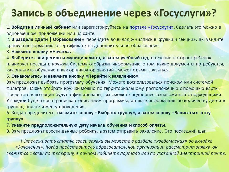 Если вы уже сделали свой выбор и знаете, какое объединение будет посещать ваш ребенок, можете подать заявление через Гос.услуги, воспользовавшись памяткой, размещенной ниже