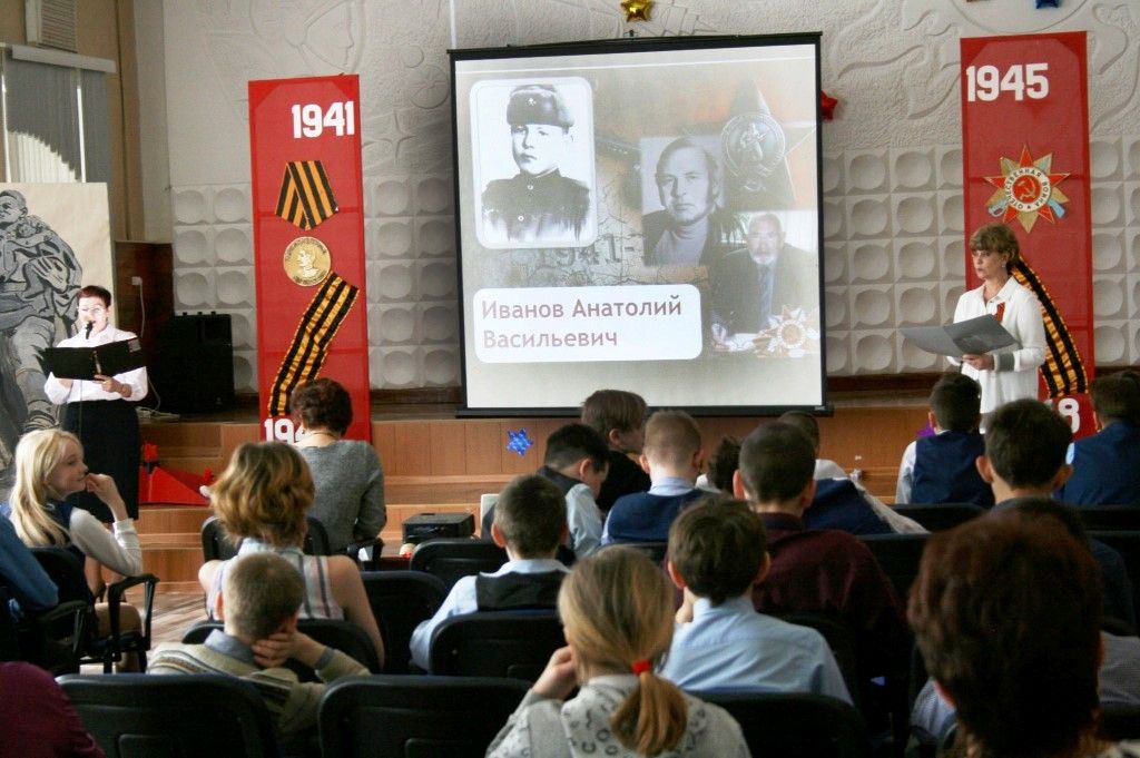 Филатова Людмила Яковлевна, член городского общества «Память сердца», рассказывает детям о своей семье, об отце, который не вернулся с войны.
