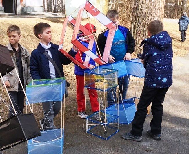 В ходе занятия, опираясь на полученные знания, ребята собирали коробчатых воздушных змеев. Конструкция воздушного змея имеет сходство с птицей. Воздушный змей – летательный аппарат, удерживаемый с земли при помощи леера и поднимаемый за счёт силы ветра. Виды конструкций: плоские, каркасные, ячеистые и коробчатые.