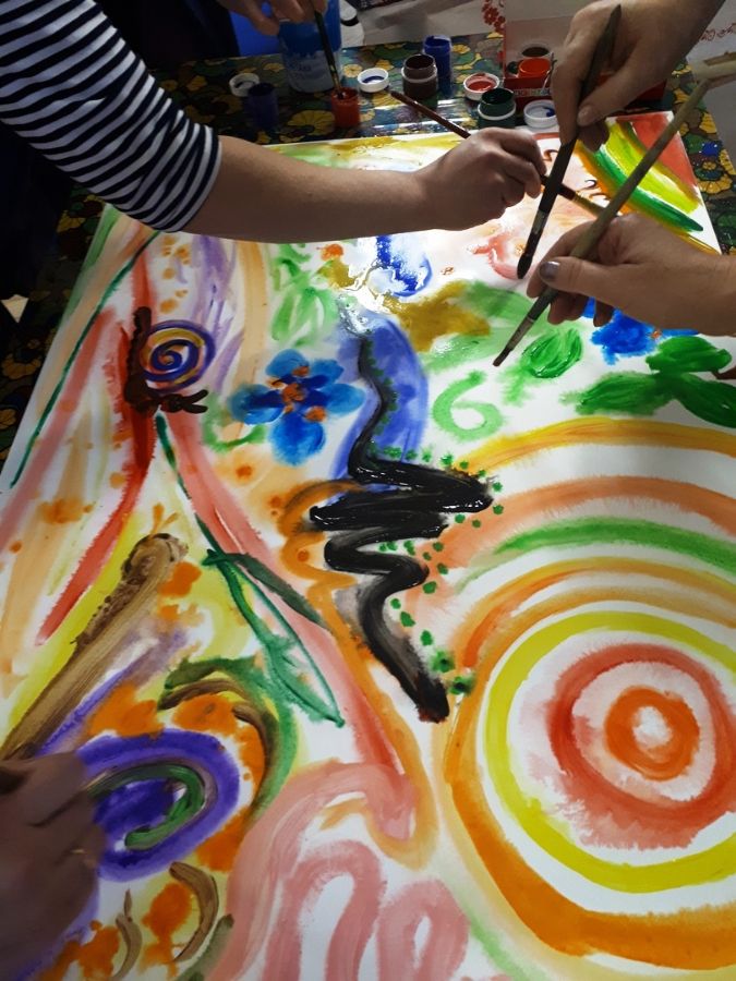 Занятия проходили в очень тёплой, творческой атмосфере; присутствующие на практике познакомились с некоторыми упражнениями арт-терапии, с удовольствием выполняли задания: учились взаимодействовать без слов, лепили друг другу подарки из солёного теста и рисовали. На бумаге, на соли, на воде; красками, карандашом, ручкой…