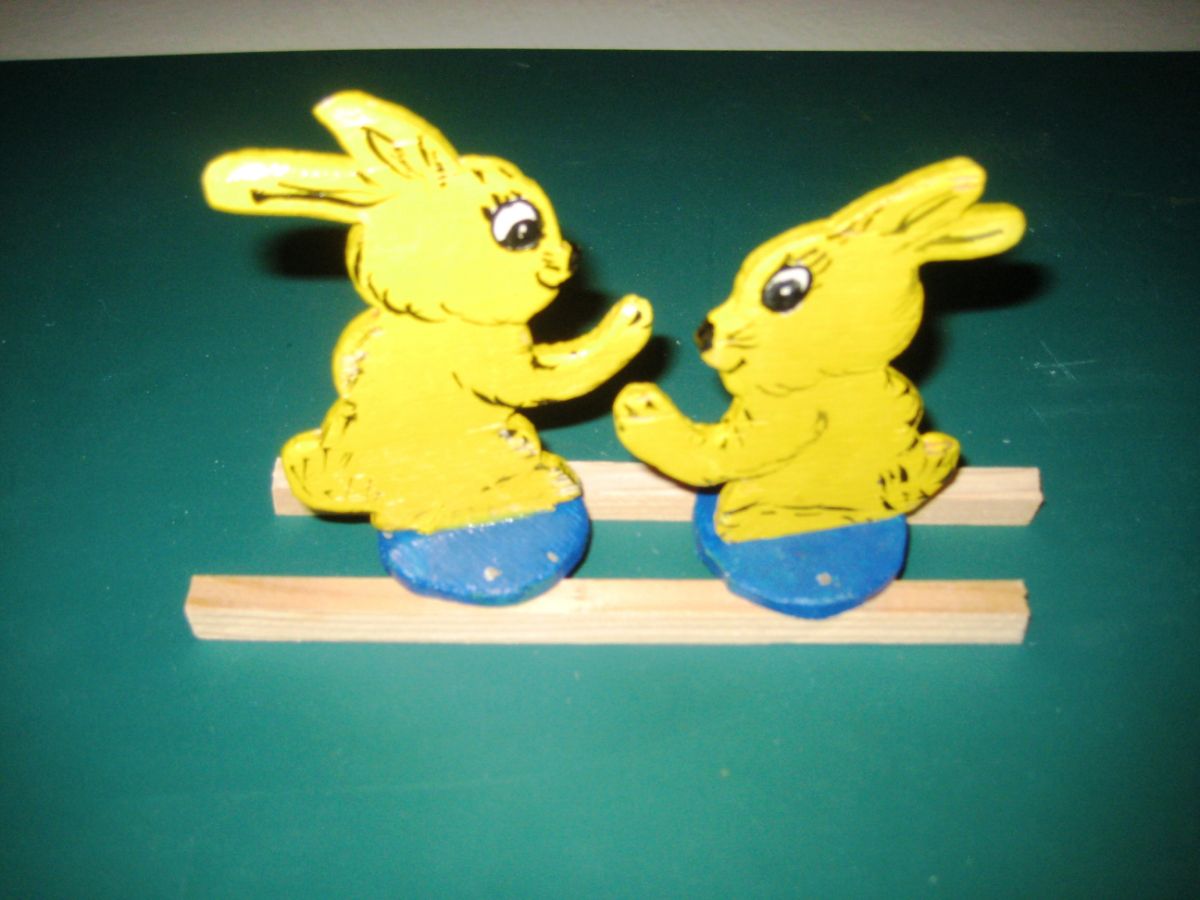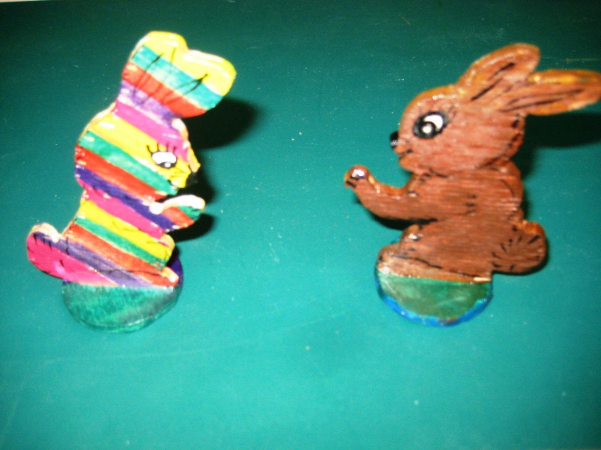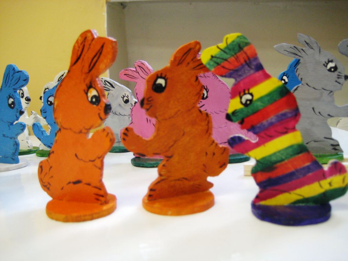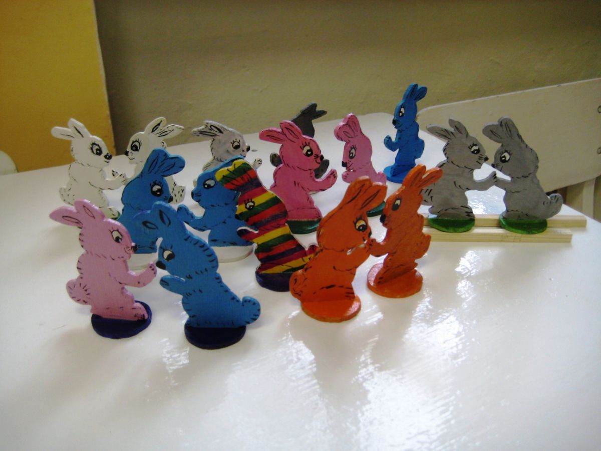 Учились выпиливать на простых фигурках: звездочки, сердечки, ракеты, ёлочки. А затем каждый выпилил зайчика на подставке. При этом освоили выпиливание внутренних отверстий, научились подгонять детали друг к другу. Справились все! Ребята постарше успели выпилить двух зайчиков. Их мы соединили в механическую подвижную игрушку. Творческий подход дети проявили при раскрашивании. В результате у нас получилась целая семейка длинноухих смешных зайцев – синих и розовых, серых и белых, солнечных и радужных, и даже шоколадных!