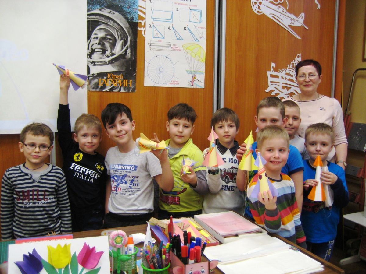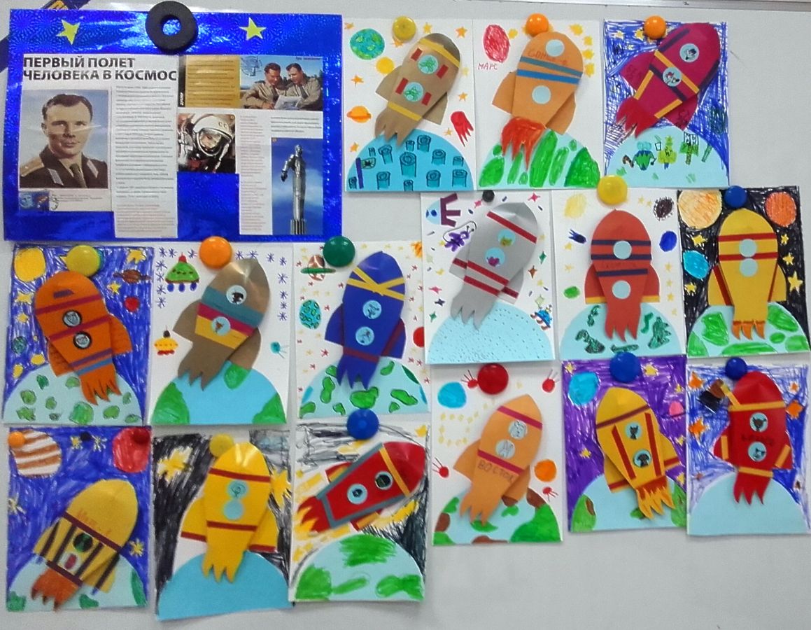 Были изготовлены работы: ракета с парашютом, динамическая игрушка – ракета, выполнена объемная аппликация ракеты. Прошла выставка работ учащихся.